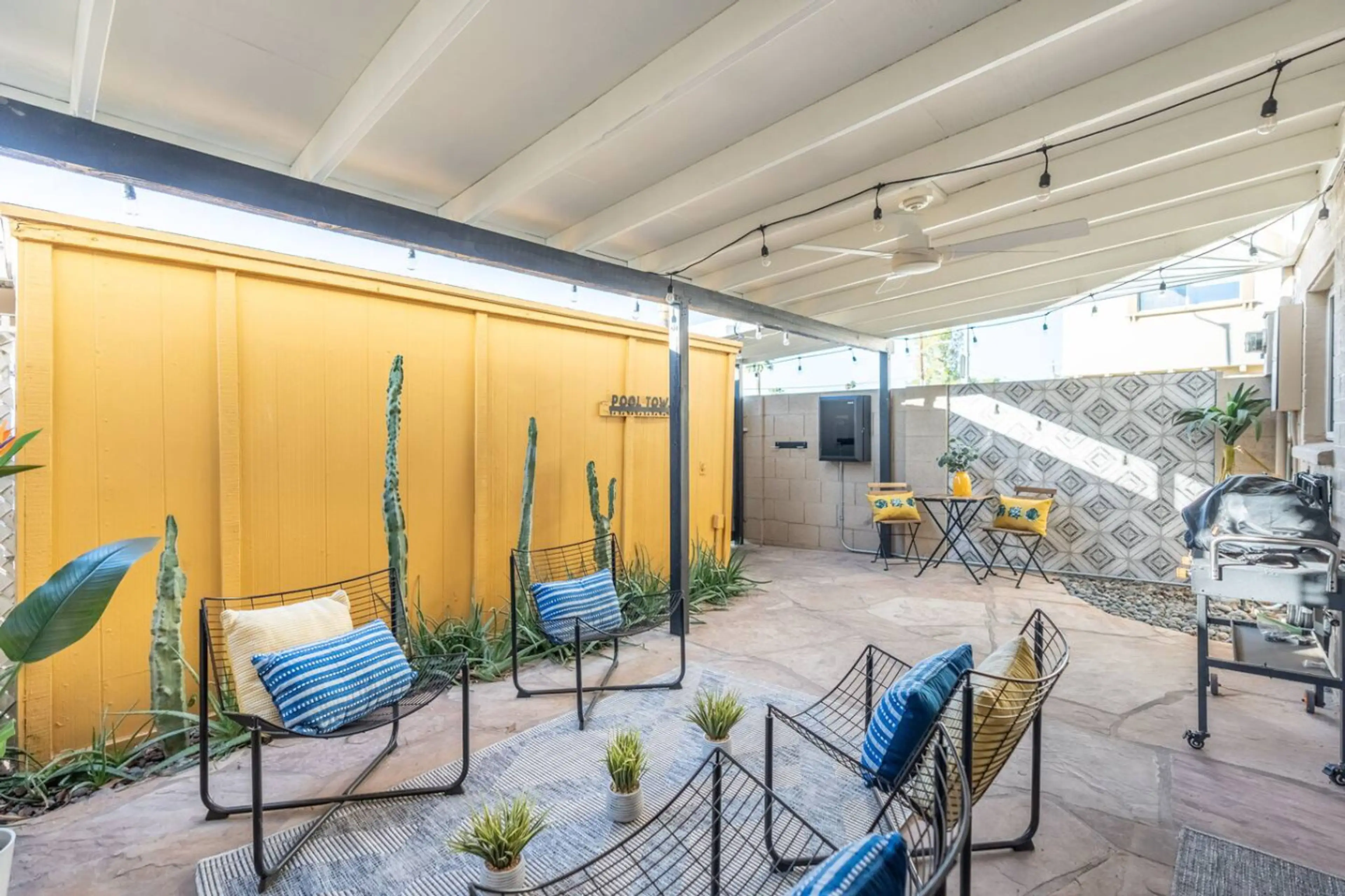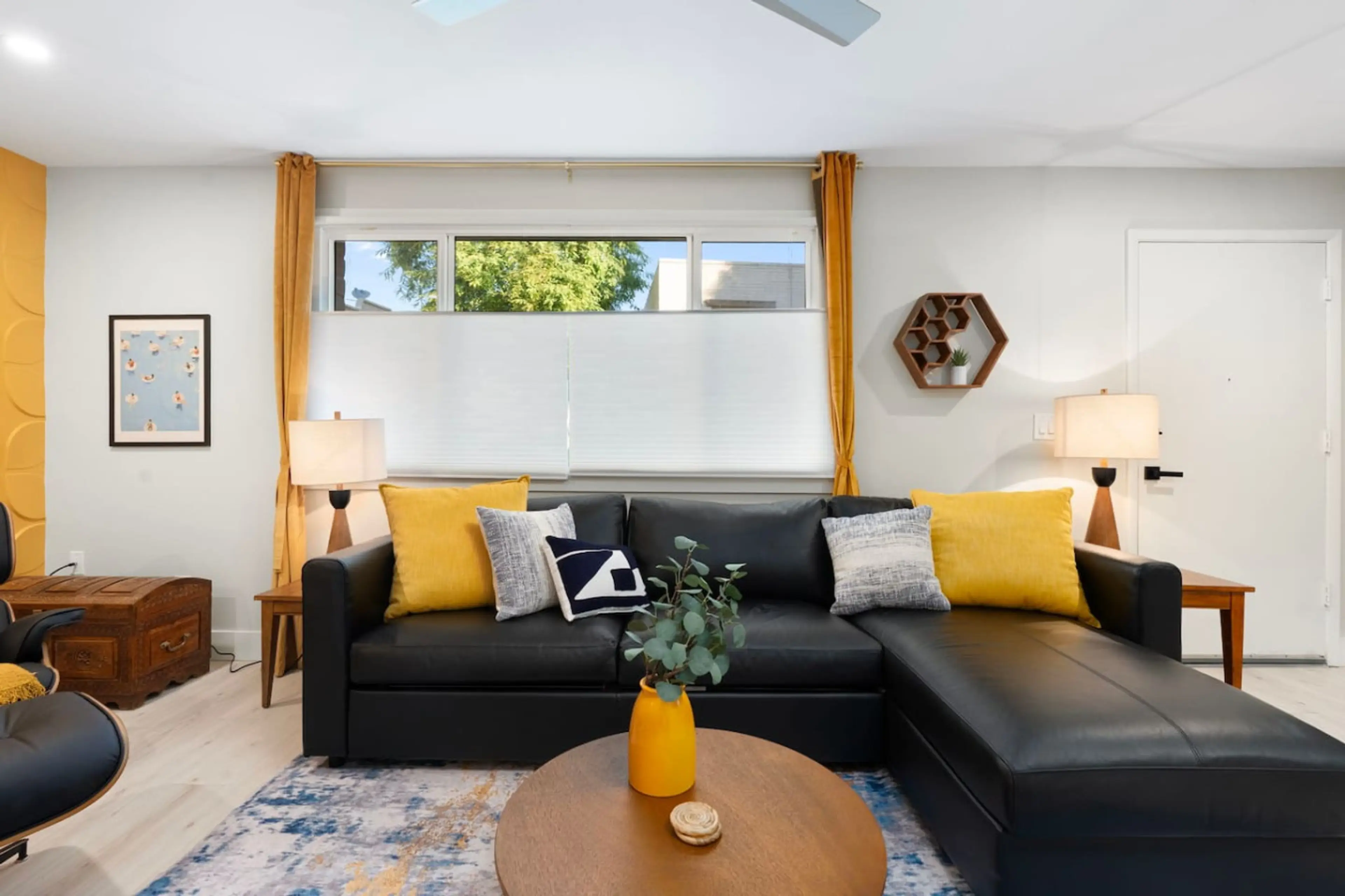 Relax and recharge in this bright, modern getaway that perfectly blends style and comfort. The open living space features a bold golden accent wall, a plush sectional sofa, and a smart TV for movie nights! Natural light fills the room, highlighting the cozy textures, warm tones, and contemporary dé...
